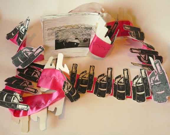 Book Object. Woodcut printed elements, Satin blanket binding, Rives BFK paper, Found photos, My old dirty panties (repurposed), Lace, Polyester Georgette, Polyester thread, Silver sparkle pen, ballpoint pen, Machine sewn. Dimentions Vary. 2011.