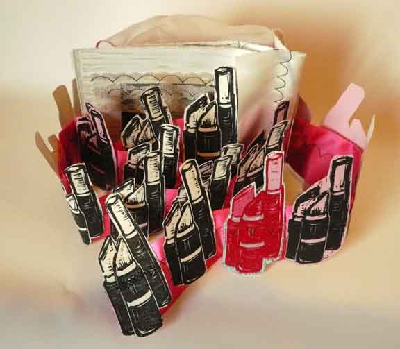 Book Object. Woodcut printed elements, Satin blanket binding, Rives BFK paper, Found photos, My old dirty panties (repurposed), Lace, Polyester Georgette, Polyester thread, Silver sparkle pen, ballpoint pen, Machine sewn. Dimentions Vary. 2011.