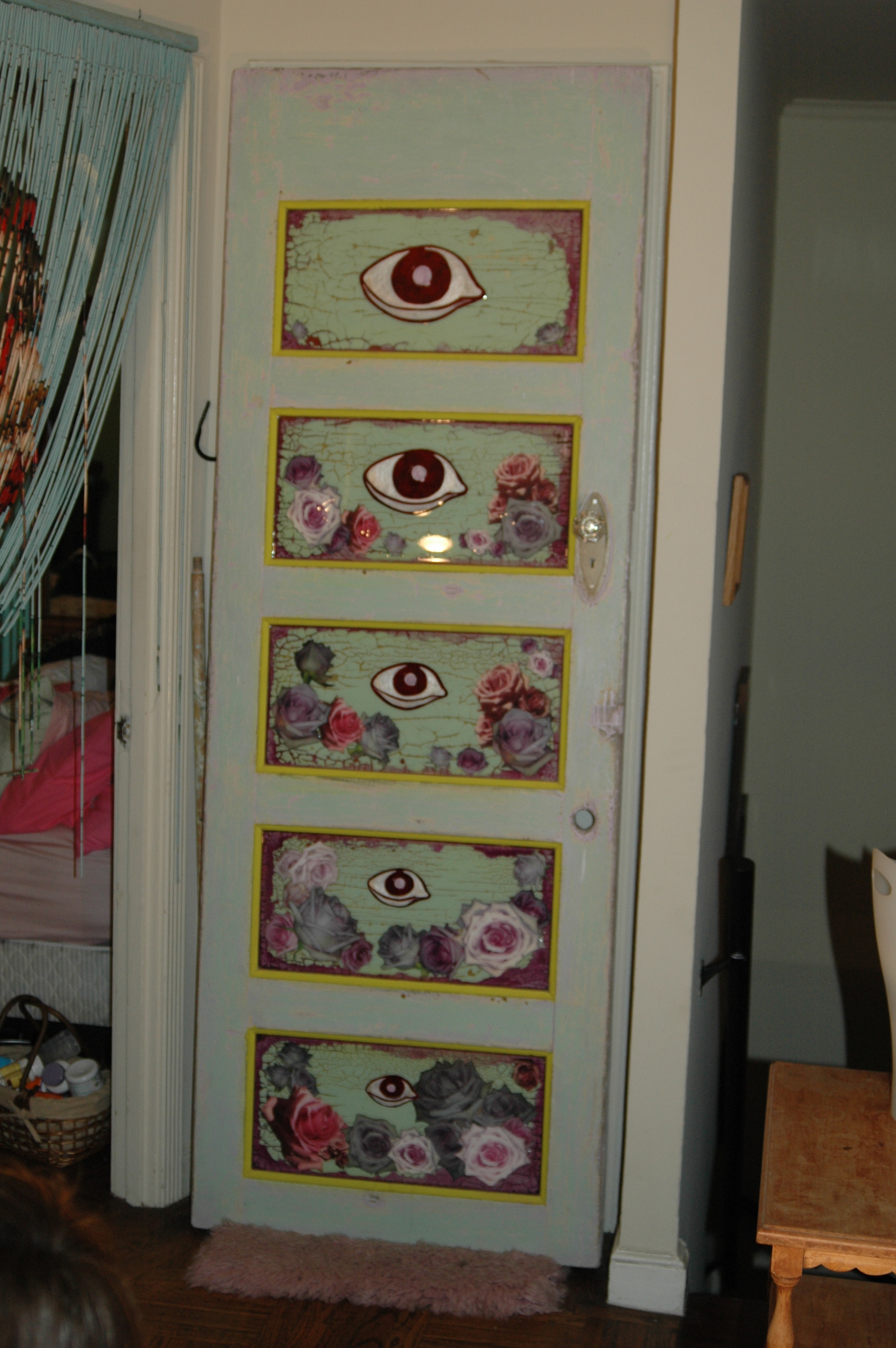 Found door, painted leather eyeballs, One dozen roses photographed daily, Printed on metallic paper, Resin, House paint, Acrylic paint, Real crystal knob, Found hardware. 81.5” x 29” x 1.5”. 2012