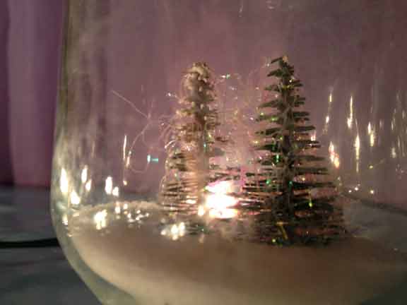 Jars collected and washed many times in a week, tiny Christmas trees, glitter and salt. Spray paint, super glue, silver metallic electrical tape and Christmas Magic. With recovered lights, vinyl and polyester sheer drapes.
