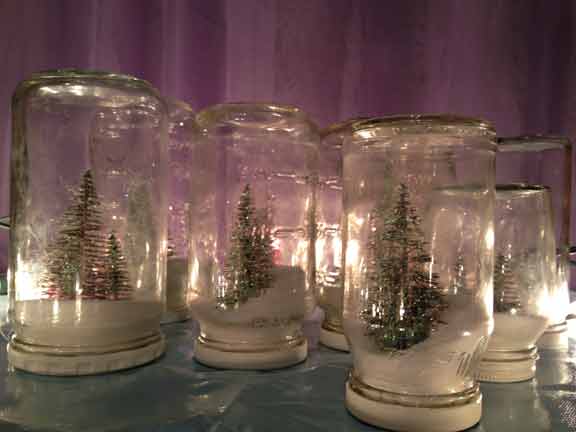 Jars collected and washed many times in a week, tiny Christmas trees, glitter and salt. Spray paint, super glue, silver metallic electrical tape and Christmas Magic. With recovered lights, vinyl and polyester sheer drapes.