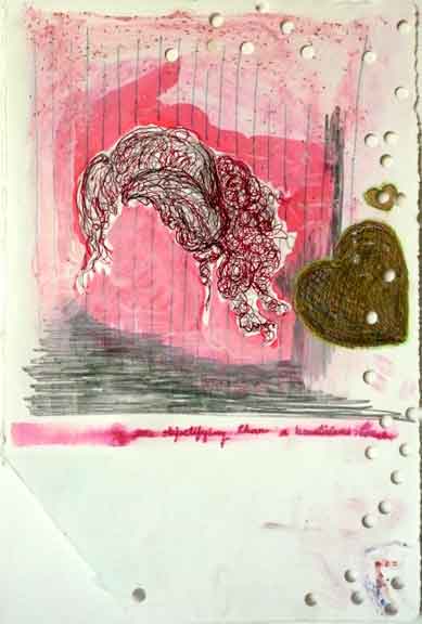 BeauticiansTouchWEB ← Previous Next → “There is Nothing More Objectifying than the Beauticians Touch.” Drawing. Ink, Ballpoint pen, Gouache, Sparkle pen, Gold paint pen, Graphite on Rag paper. With hole punches and cropped corner. 9.5 x 8 inches. 2010. Like Loading...