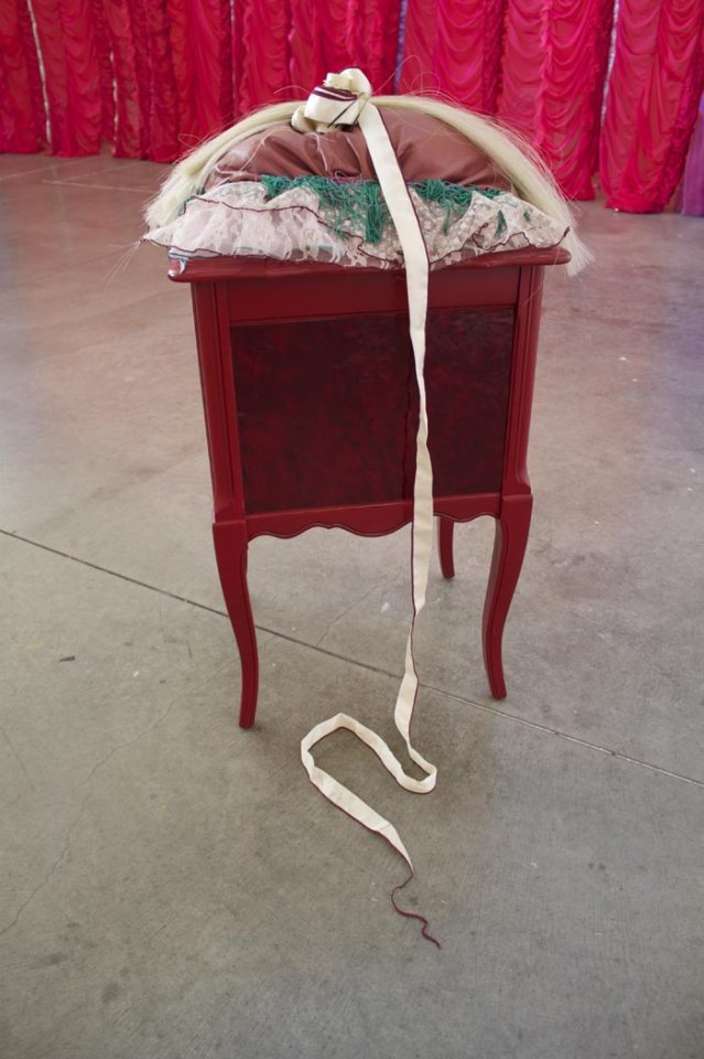 IMG_0034 ← Previous Next → Trophy Hair on Flesh Box Sculpture. Horse hair, ribbon, leather, polyester georgette, polyester sheep, polyester lace, brocade, satin blanket binding, upholstery brads, bedside table, panel, glue, hair roller, spray paint. 16” x 19” x 35”. 2010 Like Loading...