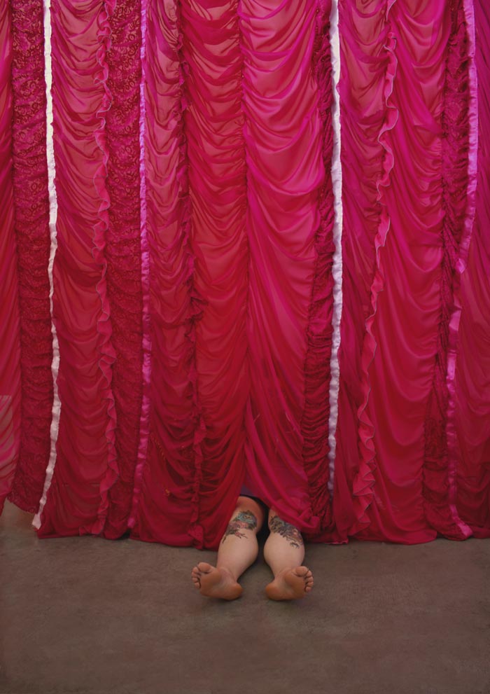 Polyester sheer, polyester thread, polyester lace, undecernable synthetic fabric blends, wired ribbon, sewing pins, fray check, satin blanket binding, wooly nylon thread, masking tape, duct tape, staples. Hung on a curtain rod with 1” brass clamp rings. Installed 3’ feet off the wall, painted in ‘Ruffles’ colored house paint. Backlit by mirrored, wall mounted, 4 bulb bathroom fixtures, with 60-watt bulbs and satin-sheathed cords. 36” x 120” x 264”. 2010