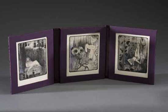3NightmaresofFertilityWEB ← Previous Next → “3 Nightmares of Fertility” 3 frames book structure, Davey board, book cloth, pva. Photo intaglio, Printed a la poupe, on sommerst paper, gouache Each image 5 x 7inches 9 x 24.5 inches July 2006 Like Loading...