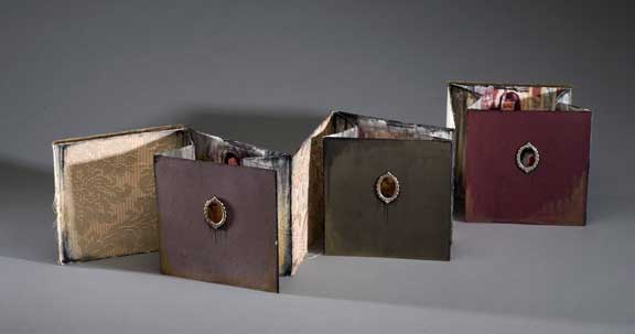 Accordian book structure with 3 “chambers”. Mixed media, guache, digital photo, pen, gelly pen, ink, acrylic, gesso, sommerset paper, matte board, Bristol paper, davey board, velvet, PVA, plastic epoxy, found objects